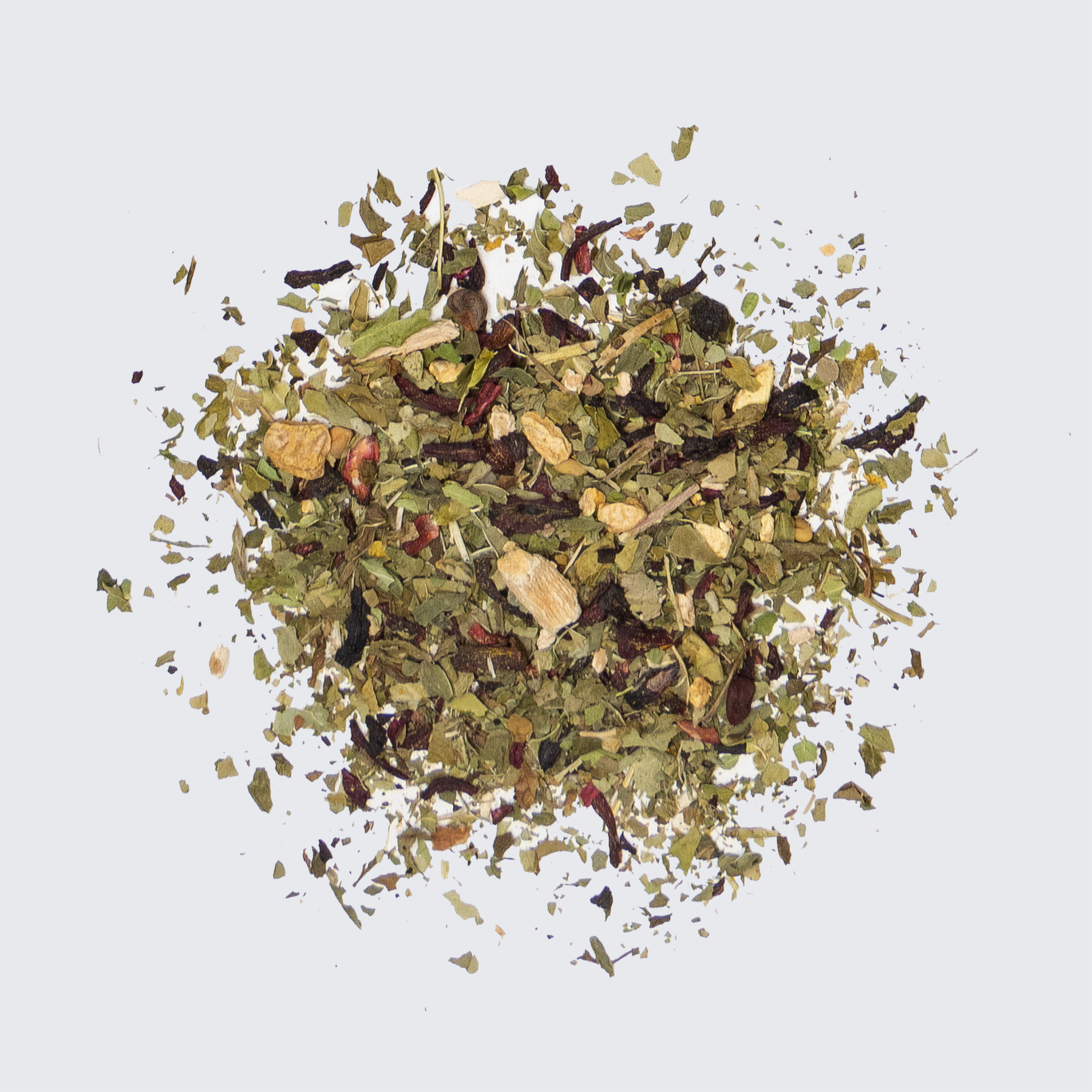 Spearmint, moringa, yerba mate, damiana, cinnamon, gotu kola, ashwagandha, lavender, hibiscus, juniper berries, ginger, slippery elm, tomato flakes, turmeric, black pepper, fenugreek.