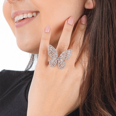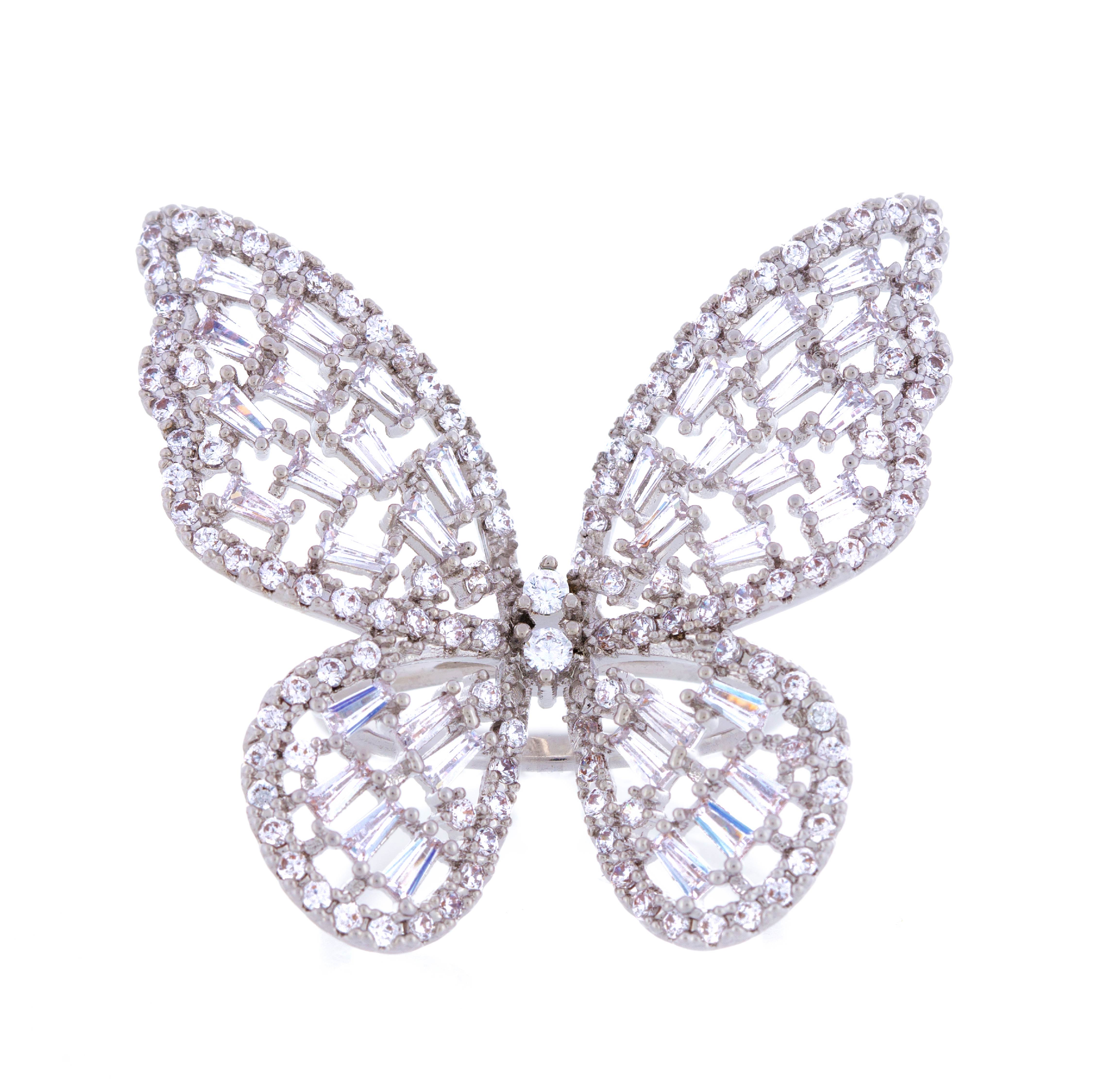 Rhodium Plated Ring - Large butterfly embedded with zirconia posed on a simple rhodium plated band.